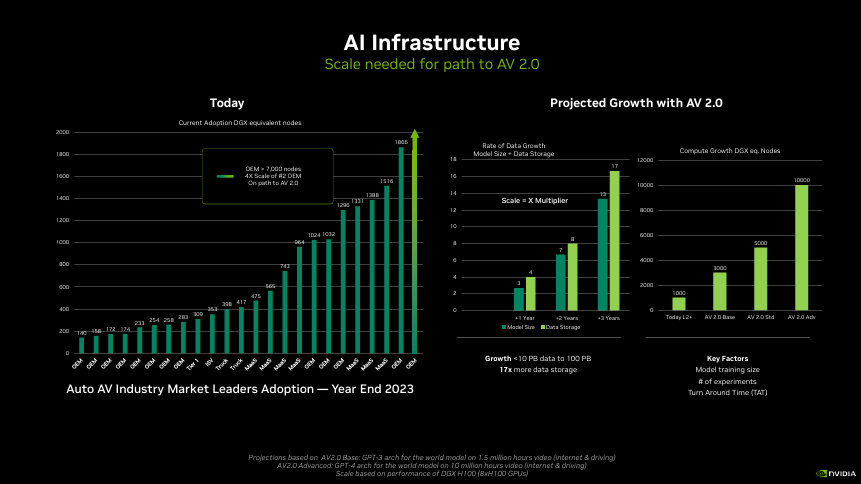 Norm Marks还预计,未来自动驾驶汽车2.0转型的模型规模将增长13倍,数据存储规模将增长17倍。而如果以GPT4作为基础的话这可能需要上万的服务器节点,即达到超算水平。