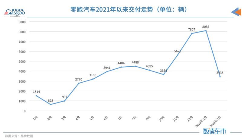 相比上述品牌2月交付都在6000辆以上,零跑汽车2月的交付表现并不突出,受到芯片、电池供应链紧张以及春节因素影响,零跑当月交付量仅有3435辆,同比增长447%。