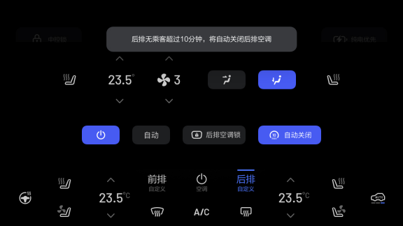 6、 新增后排空调自动关闭功能,用户可在空调控制屏点击后排开启此功能。