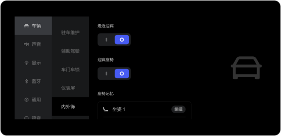 7、新增座椅迎宾功能,用户可在设置-车辆-内外饰中开启此功能。