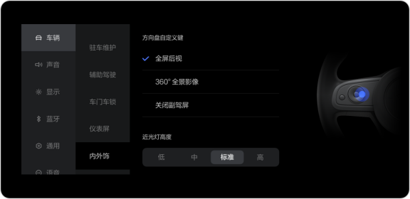 10、调整了方向盘左侧右键为自定义按键,用户可在设置-车辆-内外饰中选择自定义按键的功能。