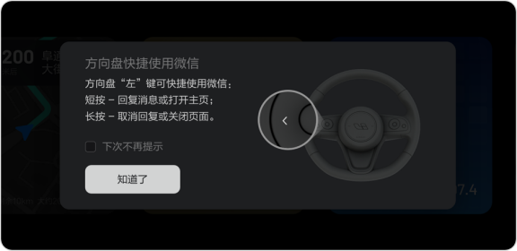 11、调整了方向盘左侧“左键”为微信键,用户可点击方向盘左侧的“左键”完成打开微信、回复消息等功能。