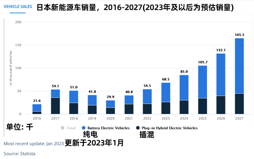 根据Statista的数据,日本2022年仅仅卖了5.45万辆新能源,新能源销量连咱们(567.4万辆)的1%都没摸到,市场份额仅有1.3%。虽说日本市场整体规模只有咱们的1/7-1/6,但是新能源卖得这么拉胯的确是说不过去的。