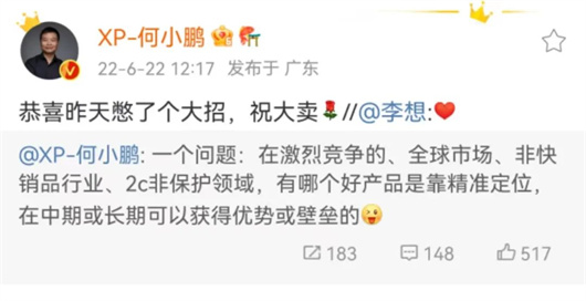 言论一出,很快便引得李想的亲自下场回复,并配以“爱心”的表情。何小鹏则再度回应道:“恭喜昨天憋了个大招,祝大卖。”