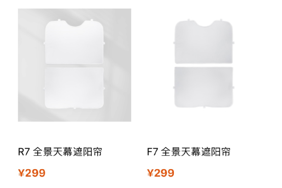 当然,有车企也关注到了用户的需求,推出官方遮阳帘产品。比如特斯推出的Model Y遮阳帘,在某宝旗舰店的售价为790元;飞凡在官方APP商城售卖的R7和F7遮阳帘,售价为299元。