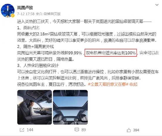 为了不在夏天把车主逼疯,一些车企也开始着手改善。比如岚图追光就给全景天幕配备了双电机卷帘,官方宣称遮光率可达100%。